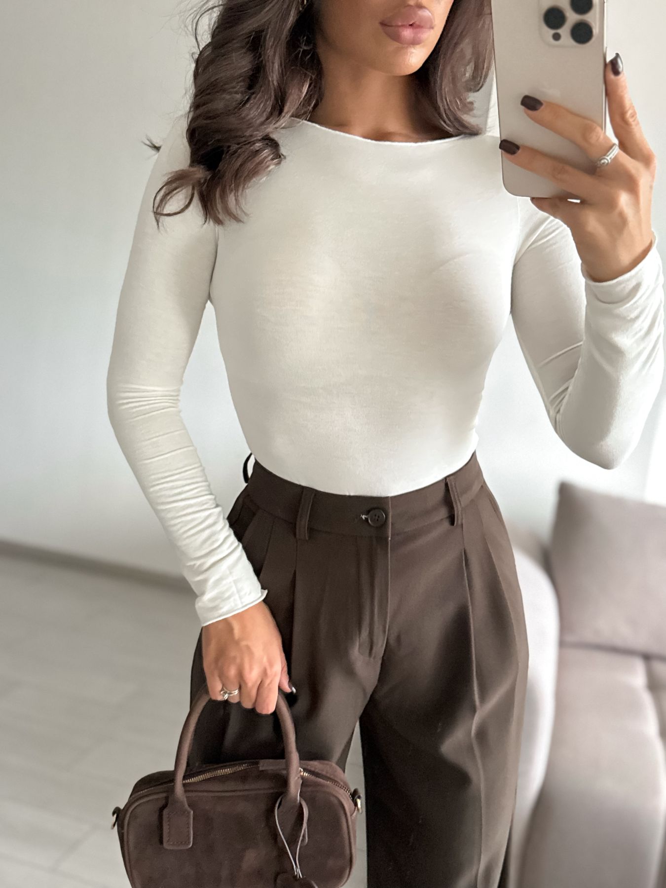 Elegáns, testhezálló sziluett finom, illúziós nyakkivágással, amely modern és nőies megjelenést kölcsönöz.