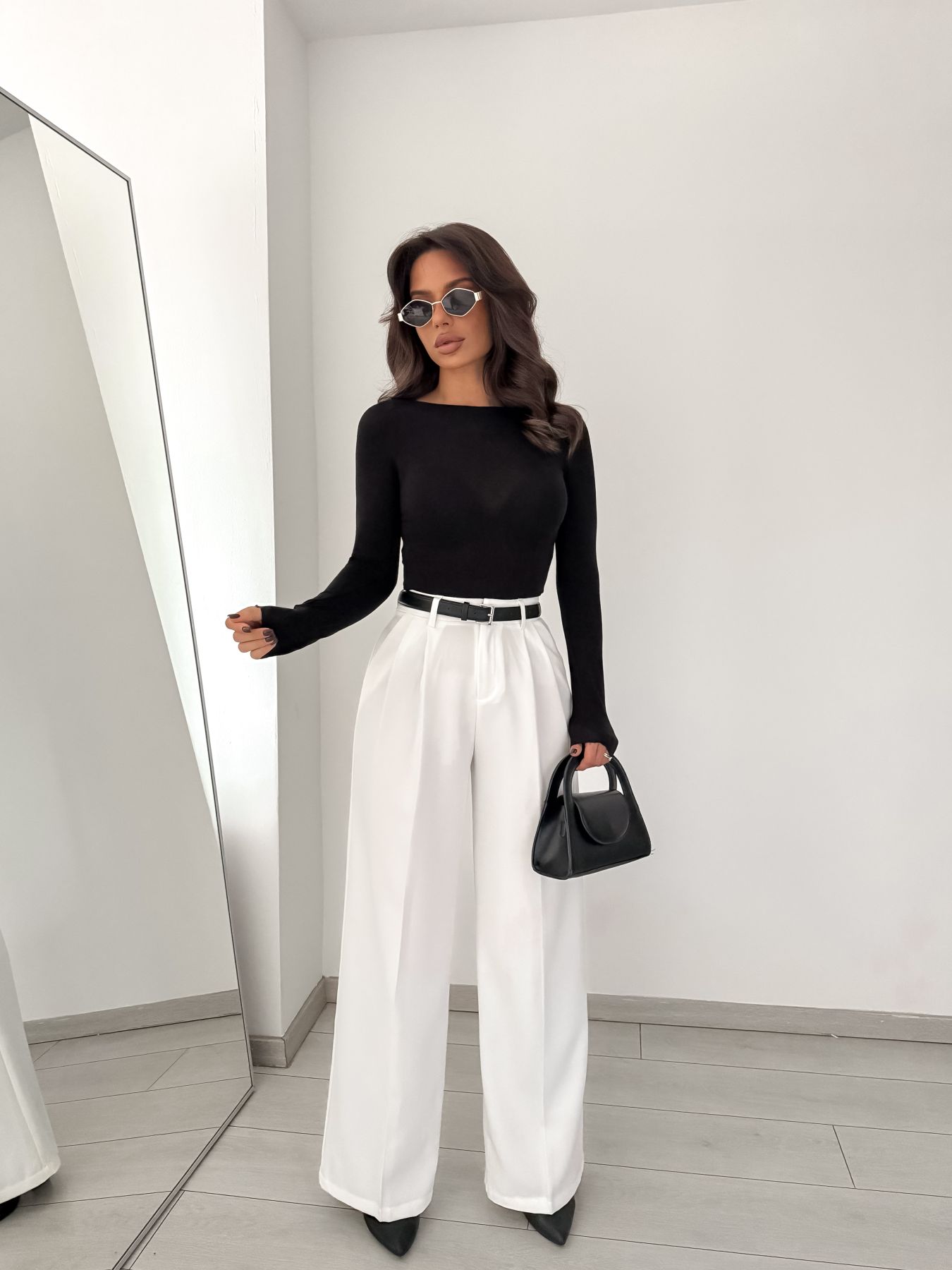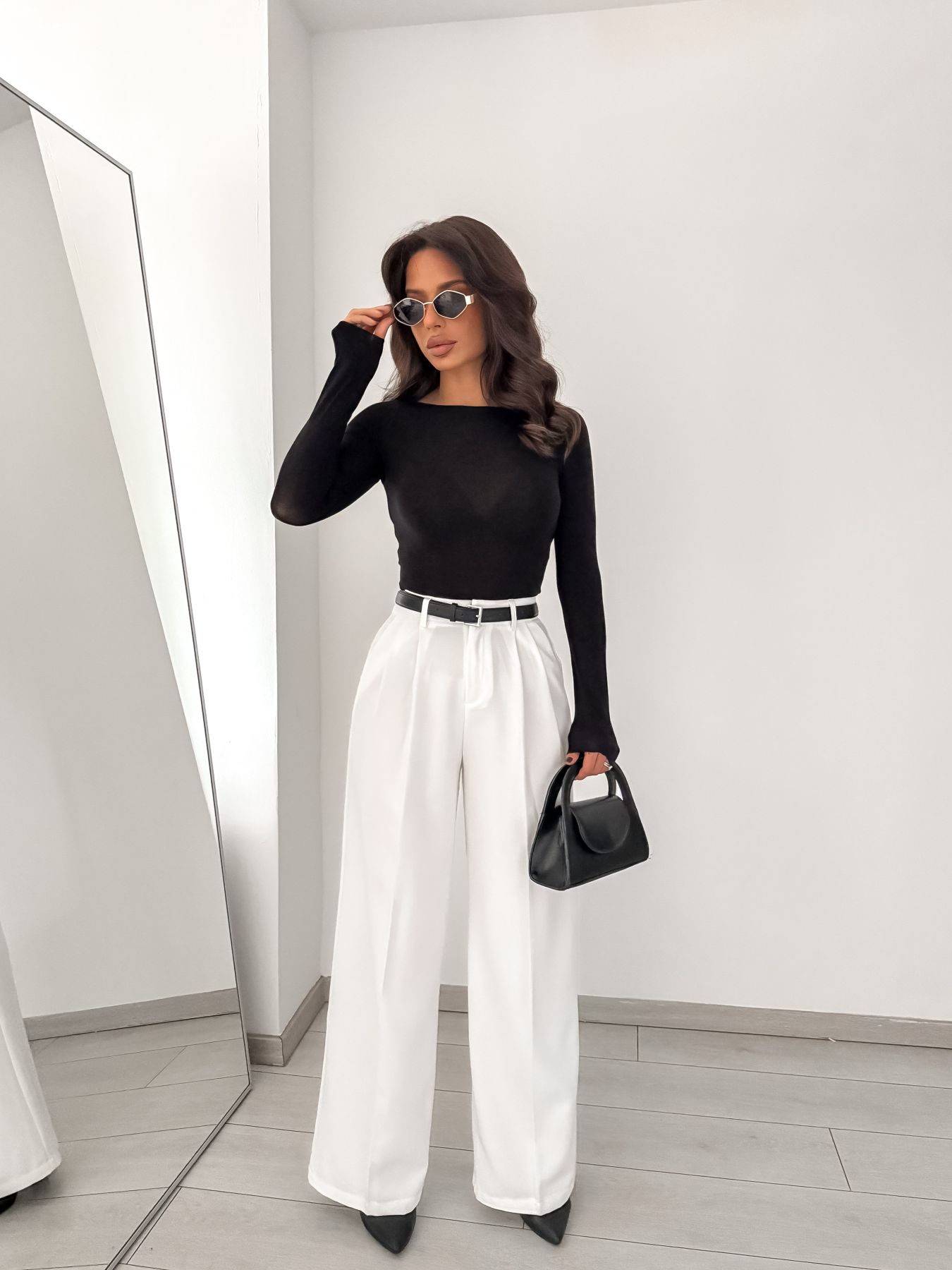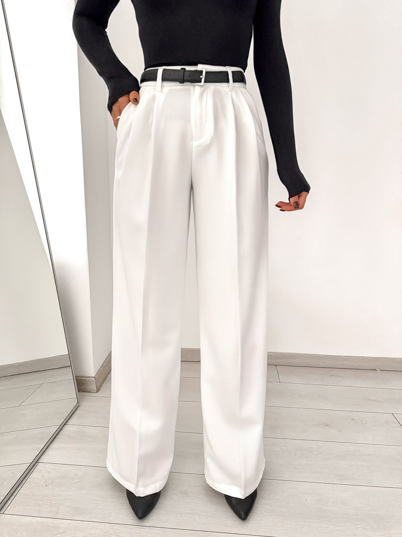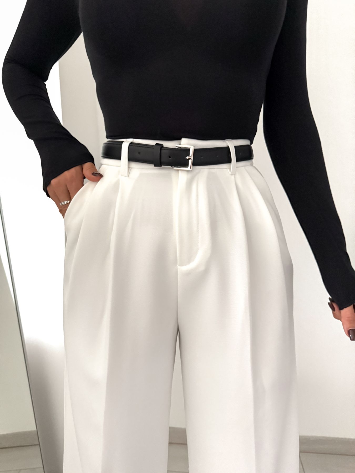 Emelt szintű elegancia modern kivitelben. A karcsúsító magas derék és a stílusos fekete öv különleges megjelenést biztosít, miközben a prémium anyag könnyű, mégis tartós és formás. Tökéletes egyensúly a kényelem és a kifinomultság között – minden szettet könnyedén elegánssá varázsol.